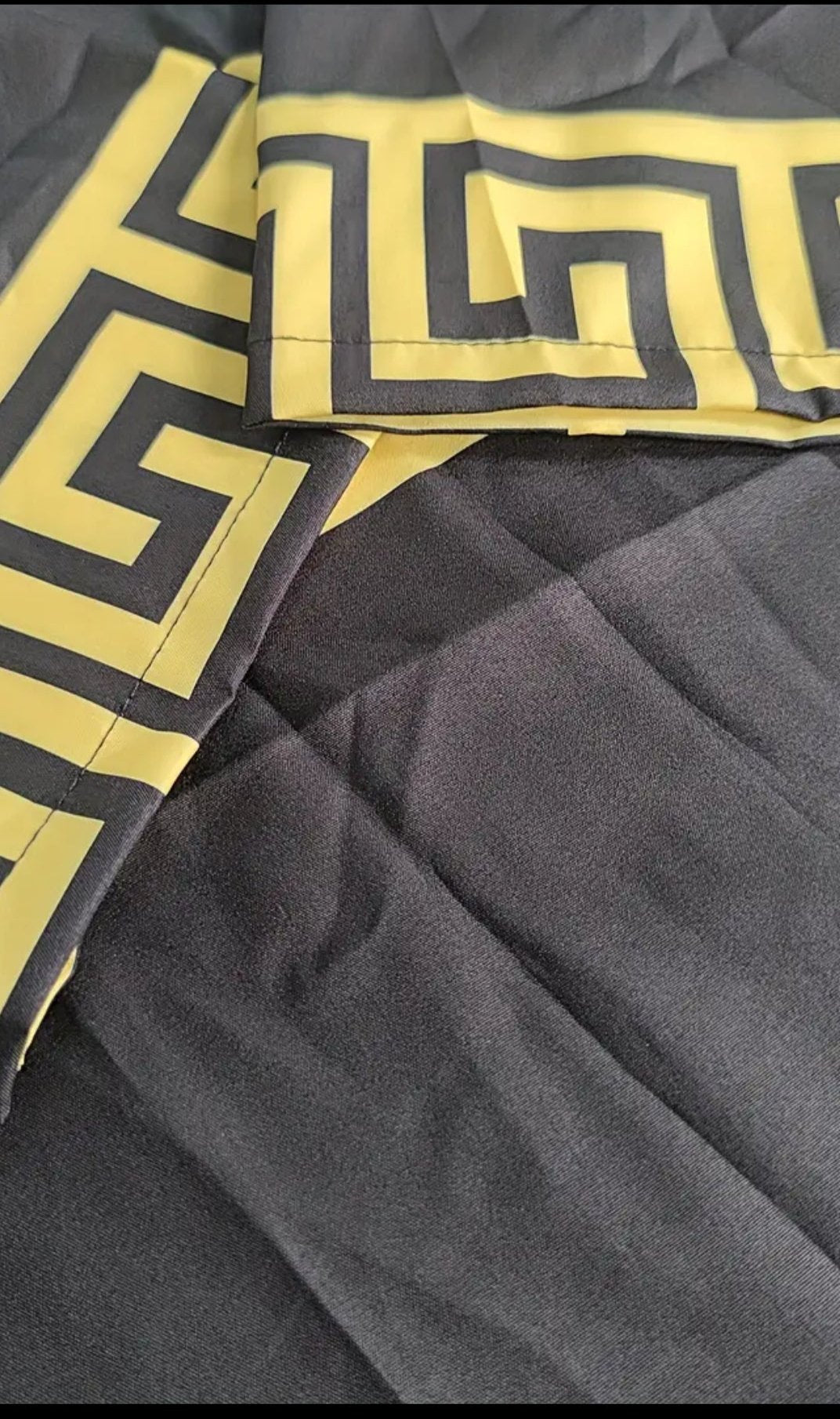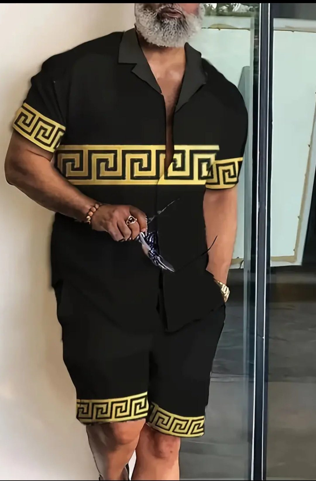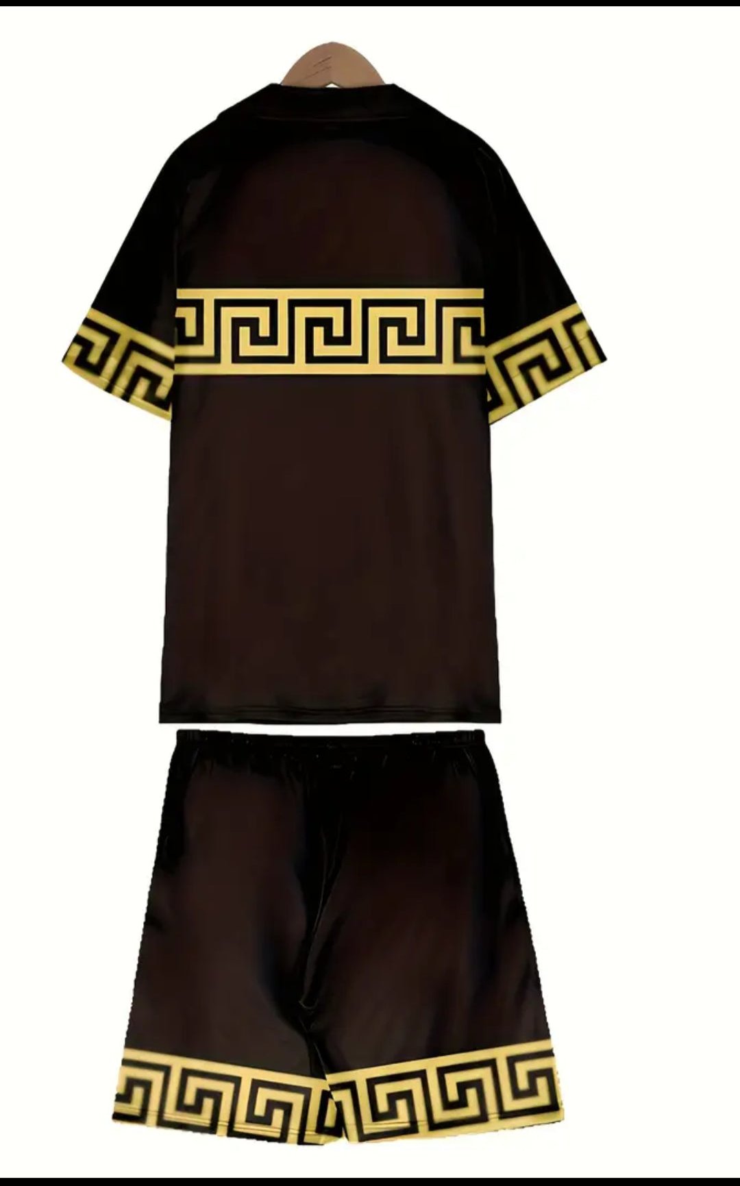 The black and gold men's Greek key 2-piece short set features a stylish short-sleeved shirt adorned with an eye-catching Greek key pattern in shimmering gold, perfectly complementing the sleek black fabric. The matching shorts are designed for comfort and ease, with an elastic waistband for a relaxed fit. This set is ideal for casual outings or summer parties, combining a trendy aesthetic with a touch of sophistication that pays homage to ancient Greek motifs. Perfect for fashion-forward individuals looking to make a statement."