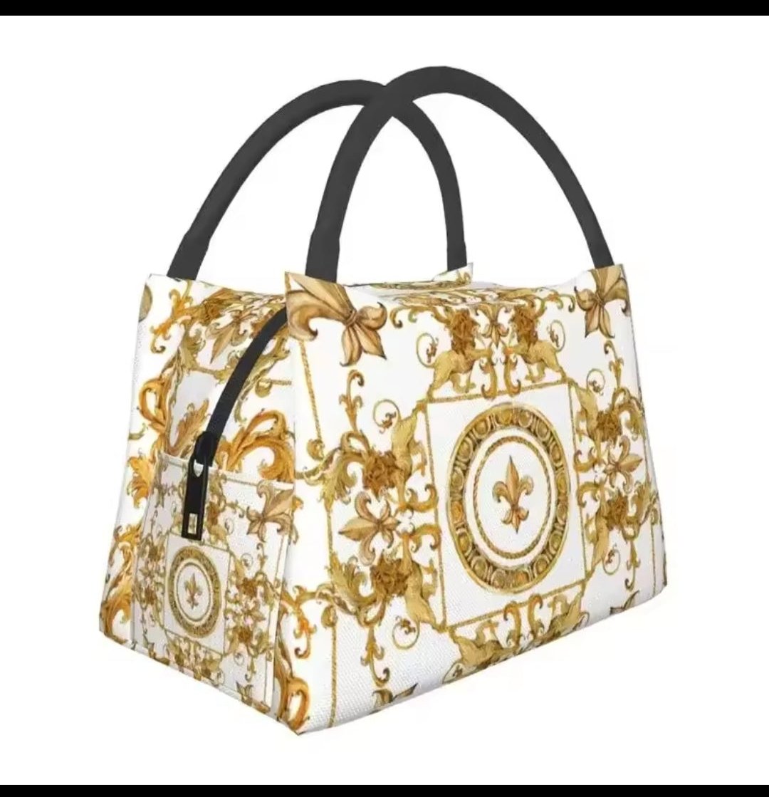 The white gold leaf lunch bag is a stylish and practical accessory designed to keep your meals at the ideal temperature. Featuring a sleek exterior adorned with an elegant gold leaf pattern, it blends sophistication with functionality. The insulated interior is crafted to maintain heat for hot foods and keep cold items chilled, making it perfect for a variety of lunches. With a spacious main compartment, easy-access front pocket, this lunch bag is both fashionable and highly functional, ideal for work, school, or picnics.